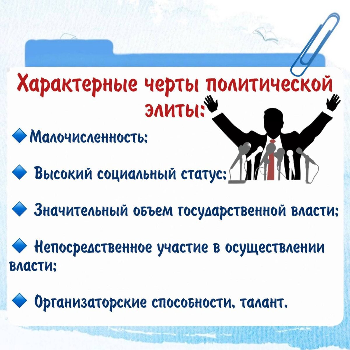 : • Малочисленность • Высокий социальный статус • Значительный объем государственной власти • Непосредственное участие в осуществлении власти • Организаторские способности, талант ⠀ ❓Понятно? Отлично! Едем дальше! Причины существования политической элиты: — Необходимость профессионального управления обществом — Социальное и психологическое неравенство людей; их неодинаковые способности и желание участвовать в политике. — Интеллектуальные различия, организаторские способности — Политическая пассивность большинства людей Не жалейте 🔥и постарайтесь запомнить материал! 📌Классификация политической элиты здесь! Мой резервный канал в мессенджере MAX #полезноеобщага