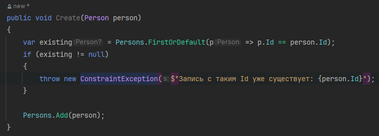 Поскольку метод Create должен создавать человека, он получает его на вход. Мы сначала проверяем, не существует ли уже этот человек, по Id. Если такого человека нет, то метод Persons.FirstOrDefault() вернёт null и мы зайдём в if, где будет кинуто исключение.