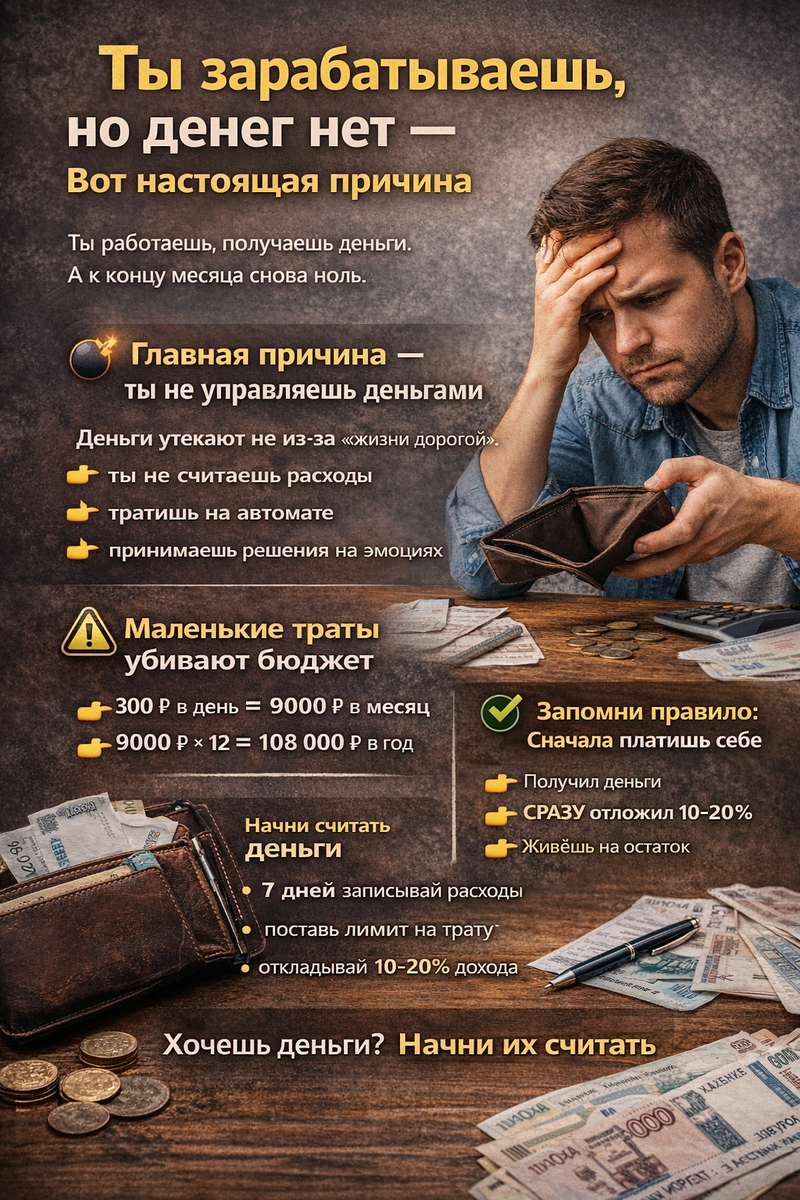 Тогда давай без иллюзий: проблема не в зарплате. Деньги утекают не из-за «жизни дорогой». Они утекают потому что: 👉 Пока нет контроля — нет денег. Всё просто. Сейчас у тебя в голове: Факт: