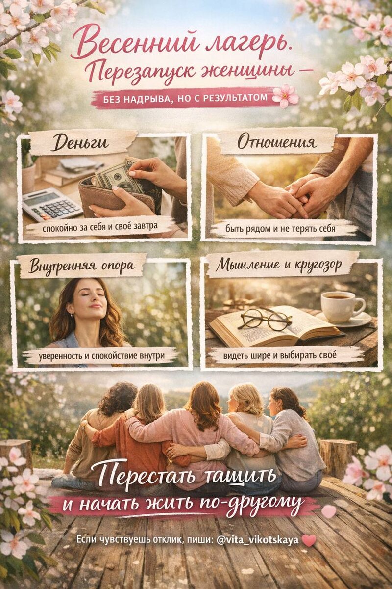 Твой перезапуск — без надрыва, но с понятным и измеримым результатом. Знаешь, есть состояние, когда ты вроде справляешься, но внутри всё время напряжение, как будто жизнь держится на тебе, и если ты чуть расслабишься — всё посыпется. Весенний лагерь — не про «добавить ещё нагрузку», а наконец выдохнуть, но при этом не потерять деньги, отношения и себя. Первое — деньги Ты узнаешь не просто «как зарабатывать», а как вообще устроены твои деньги: — куда они утекают — почему ты сама себе занижаешь уровень — как формируется твоя финансовая реальность Деньги от мужчин. Без стыда, без иллюзий, без перекосов. Второе — отношения Можно зарабатывать и быть одинокой. Можно быть в отношениях и чувствовать пустоту. Потому что дело не в мужчине, а в том, как ты строишь эту систему. Ты увидешь: — где ты до сих пор живёшь с оглядкой на родителей — почему повторяются одни и те же сценарии — как ты теряешь себя в отношениях — почему притягиваются не те Ты начинаёшь по-другому чувствовать себя из со