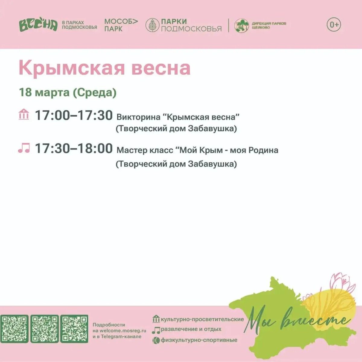 » ❤️ Уже завтра в парке пройдут тематические мероприятия, посвящённые Дню воссоединения Крыма с Россией. Вас ждут: 🔵 увлекательная викторина: проверьте свои знания об истории и культуре полуострова, вспомните важные события и интересные факты. 🔵 мастер-класс: создайте своими руками рисунок, вдохновлённый красотой крымской природы. 🗓️ 18 марта в 17:00. #культуращёлково