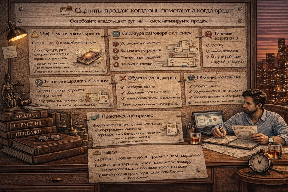 ΠΌΠΈΡΠΎΠ² β Π½Π°ΠΉΡΠΈ Β«ΠΈΠ΄Π΅Π°Π»ΡΠ½ΡΠΉ ΡΠΊΡΠΈΠΏΡΒ», ΠΊΠΎΡΠΎΡΡΠΉ Π±ΡΠ΄Π΅Ρ ΠΏΡΠΎΠ΄Π°Π²Π°ΡΡ ΡΠ°ΠΌ. ΠΠ° ΠΏΡΠ°ΠΊΡΠΈΠΊΠ΅ ΡΠ°ΠΊΠΎΠ³ΠΎ Π½Π΅ ΡΡΡΠ΅ΡΡΠ²ΡΠ΅Ρ. Π‘ΠΊΡΠΈΠΏΡ β ΡΡΠΎ Π½Π΅ Π²ΠΎΠ»ΡΠ΅Π±Π½Π°Ρ ΡΠΎΡΠΌΡΠ»Π°. ΠΡΠΎ ΡΡΡΡΠΊΡΡΡΠ° ΡΠ°Π·Π³ΠΎΠ²ΠΎΡΠ°, ΠΊΠΎΡΠΎΡΠ°Ρ ΠΏΠΎΠΌΠΎΠ³Π°Π΅Ρ ΠΌΠ΅Π½Π΅Π΄ΠΆΠ΅ΡΡ Π½Π΅ ΡΠ΅ΡΡΡΡ Π²Π°ΠΆΠ½ΡΠ΅ ΡΡΠ°ΠΏΡ ΠΎΠ±ΡΠ΅Π½ΠΈΡ. ΠΡΠΎΠ΄Π°ΠΆΠ° Π²ΡΡ ΡΠ°Π²Π½ΠΎ Π·Π°Π²ΠΈΡΠΈΡ ΠΎΡ: β ΠΏΠΎΠ½ΠΈΠΌΠ°Π½ΠΈΡ ΠΊΠ»ΠΈΠ΅Π½ΡΠ° β ΡΠΌΠ΅Π½ΠΈΡ Π·Π°Π΄Π°Π²Π°ΡΡ Π²ΠΎΠΏΡΠΎΡΡ β Π½Π°Π²ΡΠΊΠΎΠ² ΠΊΠΎΠΌΠΌΡΠ½ΠΈΠΊΠ°ΡΠΈΠΈ. π£ Π‘ΡΡΡΠΊΡΡΡΠ° ΡΠ°Π·Π³ΠΎΠ²ΠΎΡΠ° Ρ ΠΊΠ»ΠΈΠ΅Π½ΡΠΎΠΌ Π₯ΠΎΡΠΎΡΠΈΠΉ ΡΠΊΡΠΈΠΏΡ ΡΡΡΠΎΠΈΡΡΡ Π²ΠΎΠΊΡΡΠ³ Π»ΠΎΠ³ΠΈΠΊΠΈ ΠΎΠ±ΡΠ΅Π½ΠΈΡ. ΠΠ±ΡΡΠ½ΠΎ ΡΠ°Π·Π³ΠΎΠ²ΠΎΡ Π²ΠΊΠ»ΡΡΠ°Π΅Ρ Π½Π΅ΡΠΊΠΎΠ»ΡΠΊΠΎ ΡΡΠ°ΠΏΠΎΠ²: 1οΈβ£ ΡΡΡΠ°Π½ΠΎΠ²Π»Π΅Π½ΠΈΠ΅ ΠΊΠΎΠ½ΡΠ°ΠΊΡΠ° 2οΈβ£ Π²ΡΡΠ²Π»Π΅Π½ΠΈΠ΅ ΠΏΠΎΡΡΠ΅Π±Π½ΠΎΡΡΠΈ 3οΈβ£ ΠΏΡΠ΅Π·Π΅Π½ΡΠ°ΡΠΈΡ ΡΠ΅ΡΠ΅Π½ΠΈΡ 4οΈβ£ ΡΠ°Π±ΠΎΡΠ° Ρ Π²ΠΎΠ·ΡΠ°ΠΆΠ΅Π½ΠΈΡΠΌΠΈ 5οΈβ£ Π·Π°ΠΊΡΡΡΠΈΠ΅ ΡΠ΄Π΅Π»ΠΊΠΈ ΠΠΎΠ³Π΄Π° ΠΌΠ΅Π½Π΅Π΄ΠΆΠ΅Ρ ΠΏΠΎΠ½ΠΈΠΌΠ°Π΅Ρ ΡΡΡ ΡΡΡΡΠΊΡ