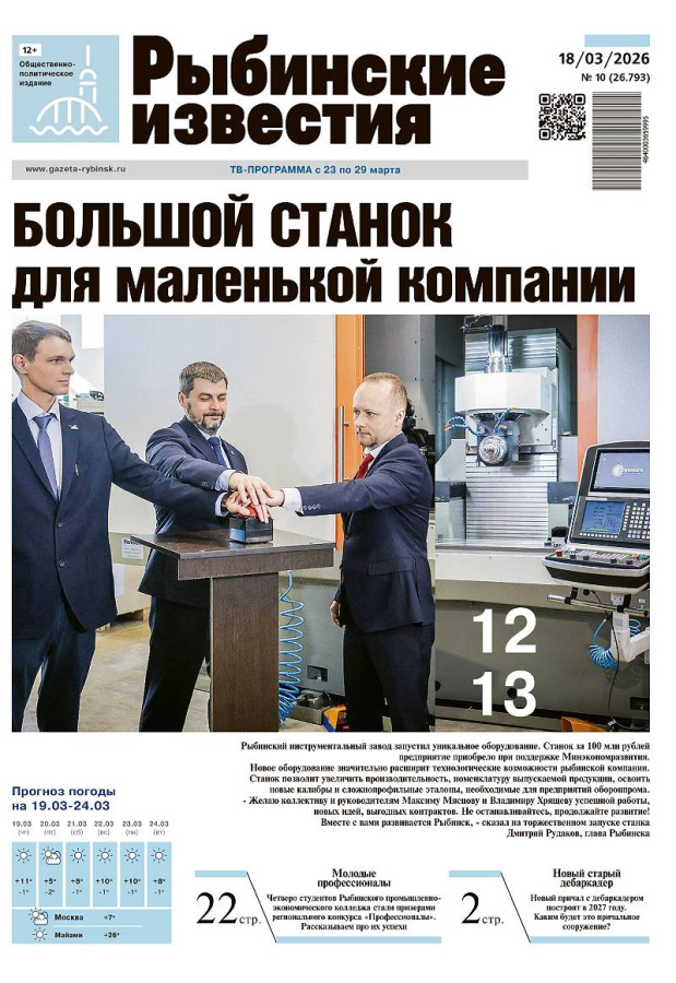 Четверо студентов Рыбинского промышленно-экономического колледжа стали призерами регионального конкурса «Профессионалы». Рассказываем про их успехи Новый причал с дебаркадером построят в 2027 году. Каким будет это причальное сооружение? Будущая профессия и семья, пространства для общения, волонтерство и патриотика: у молодых миллион тем для общения с опытными взрослыми. Свои вопросы школьники и студенты смогли задать представителям власти на встрече во Дворце молодежи За восемь лет в Рыбинске реализованы 12 проектов благоустройства общественных территорий. Территории для благоустройства и очередность работ определяли голосованием сами рыбинцы. Работы велись с 2018 года в рамках федеральной программы «Формирование комфортной городской среды» нацпроекта «Инфраструктура для жизни». Что уже благоустроили и какие пдланы на следующий год? Такого людного открытия музейной выставки даже не припомнить. 14 марта новую экспозицию в Новой бирже — «Викинги. Загадка затопленных территорий» — открыва