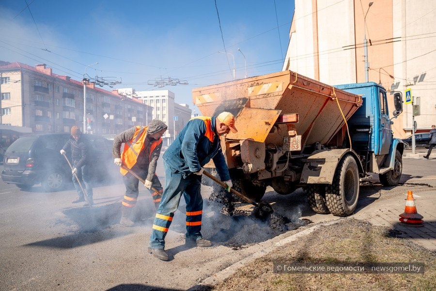 После зимних испытаний улицы нуждаются в заботе — и специалисты Гомельского городского дорожного строительно‑ремонтного треста уже давно в деле!