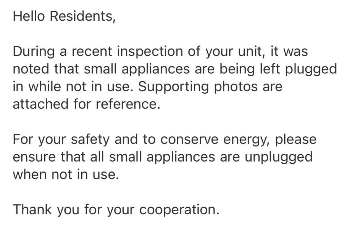 Арендодатели могут предъявлять множество претензий нанимателям. Иногда такие сообщения ставят в тупик. Так произошло с одним из пользователей Reddit, опубликовавшим переписку с хозяином своей квартиры. Тот потребовал отключать бытовую технику от сети, когда домашние устройства не используются по назначению, пишет New York Post. После очередной инспекции своей съемной квартиры арендодателем один из жильцов разместил на Reddit скриншот полученного им электронного письма: «Здравствуйте, жильцы! В ходе недавней проверки вашей квартиры было замечено, что небольшие приборы остаются включенными в розетку, даже когда не используются. Фотографии прилагаются для справки». Далее хозяин потребовал: «В целях вашей безопасности и экономии энергии, пожалуйста, убедитесь, что все небольшие электроприборы отключены от сети, когда не используются». Квартирант выразил свое недоумение в связи с этим требованием: «Кто-нибудь вообще отключает тостер от сети между использованиями?» — и уточнил несколько моме