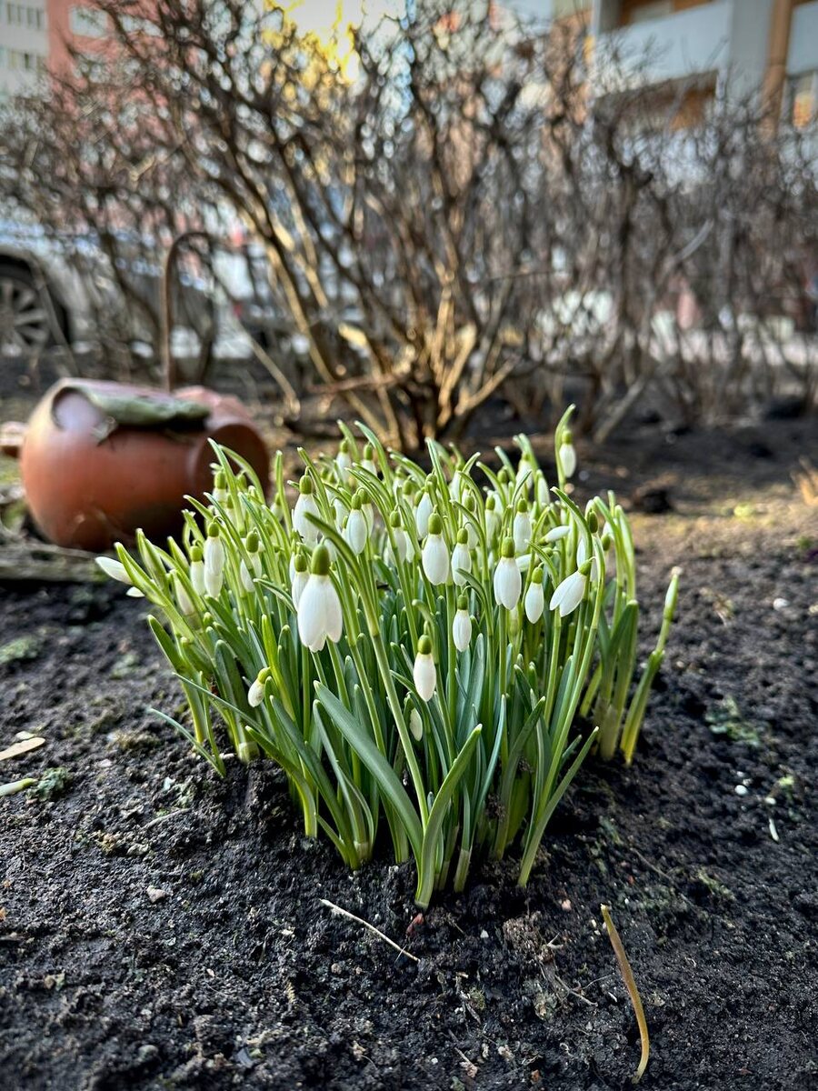 Нежность весны. Галантусы, они же подснежники в городских палисадниках.