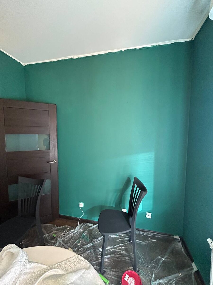 Получила очень глубокий сине-зеленый цвет. Такие цвета поначалу пугают. Мы все привыкли к светлым тонам, а здесь квартира позволяет сделать глубоким цвет стен. Краска WOW для стен, бесцветная основа. Отличная укрывистость. Работаю какими-то обрывками из отрывков. 😅 Люблю когда цельный день выделен на работу…осталось немного подкрасить.