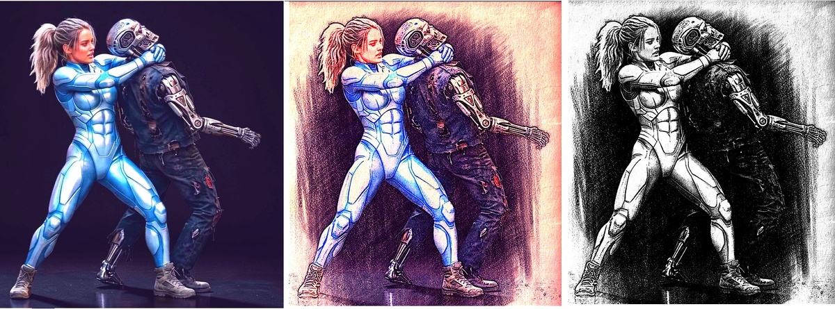Меняется наш реальный мир и вместе с ним меняется мир виртуальный. Ещё совсем недавно все ИИ в один голос заявляли, что война людей и машин невозможна. И на мои попытки нарисовать иллюстрацию драки девушки и терминатора выдавали всякие обнимашки-целовашки. И вот нате Вам! ИИ признали наконец, что война людей и роботов возможна, а значит она будет и к ней надо готовиться И надо бы иметь дома на такой случай АКМ и РПГ. Одно хорошо - иллюстрацию к своему роману я всё-таки сделал. Однако же не все читатели читали мои "Тени Торманса" (Прочитать немедленно!). И специально для таких лентяев и бездельников я помещаю небольшой отрывок, к которому иллюстрация и предназначена. А то ведь совсем непонятно, что за странная и жестокая картинка.