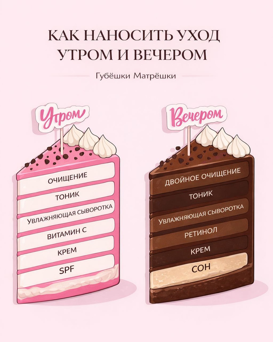 Вот представьте: стоите утром у зеркала, в одной руке сыворотка, в другой крем, и думаете «работай по быстрее, я ведь на работу опаздываю» Что же делать? Главное правило нанесения от жидкого к плотному. Текстуры наслаиваются как одежда. То есть трусы не должны оказаться поверх пальто Базовая схема утра выглядит так: Умывание → тоник → сыворотка → крем → SPF Сколько ждать между этапами: Тоник → сыворотка Ждём, пока кожа перестанет быть мокрой. Обычно 30-60 секунд достаточно Сыворотка → крем Ориентир простой: ушла липкость, можно наносить крем. Обычно это 1-2 минуты Крем → SPF Если крем лёгкий — подождите 3-5 минут. Если плотный то 5-7 минут. SPF должен лечь ровной плёнкой. Если нанести его на не высохший крем, SPF скатается и защита получится пятнами И сам SPF наносится за 15-20 минут до выхода на улицу. Солнцезащитные фильтры должны успеть впитаться и начать защищать вас Популярный вопрос: можно ли сразу SPF без крема? Да, и это нормальная практика, если • кожа жирная или комбин