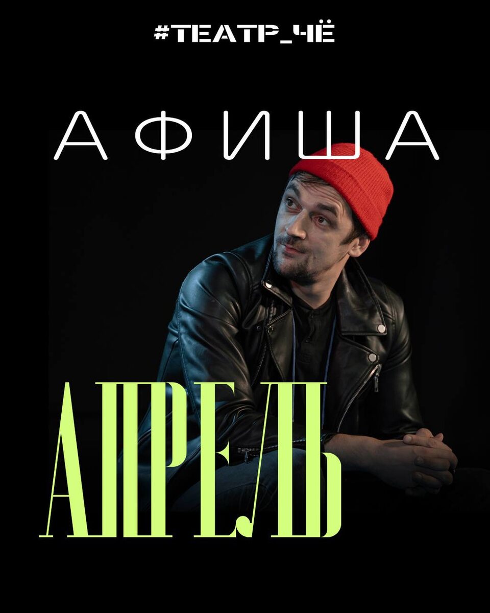: 3/04 (пт) #ЧеловекПодушка 19:00 Текст Макдонах Режиссёр Балтин. Заняты: Туравинин, Галлямов, Нечепуренко, Мишунин. БИЛЕТЫ 4/04 (сб) #ПинатьМужаНежно 19:00 Текст Которова Режиссёр Туравинина Художник Дёма Хореограф Миронова Заняты: Бевзова, Кузнецова, Туравинина, Гавриленко, Галлямов, Куликов. БИЛЕТЫ 5/04 (вс) #ДурыМыДуры 19:00 Текст Салимзянов/Максимча Режиссёр Балтин Заняты: Галлямов, Кузнецова, Щенина, Бевзова, Туравинина, Гуранова, Трофимова, Балтин, Мельниченко БИЛЕТЫ 11/04 (сб) #ЗаходитАндроидВБар 19:00 Текст Чекрыгин Режиссёр Куликова Заняты: Бевзова, Нечепуренко, Куликов БИЛЕТЫ 12/04 (вс) #БогатырьСтепанРомашкин 12:00 Текст Войдак Режиссёр Балтин Заняты: Бадамшин, Галлямов, Сафарьян, Мельниченко, Кузнецова, Ковалёва БИЛЕТЫ 12/04 (вс) #МамаНаВостоке 19:00 Режиссёр Балтин Заняты: Мафенбайер, Засеев, Туравинин, Сафарьян БИЛЕТЫ 17/04 (пт) #СкажиМне 19:00 Режиссёр Туравинина Художник Дёма Заняты: Кузнецова, Туравинин, Туравинина БИЛЕТЫ 18/04 (сб) #НабоковЧЁртоваДюжина 19:00