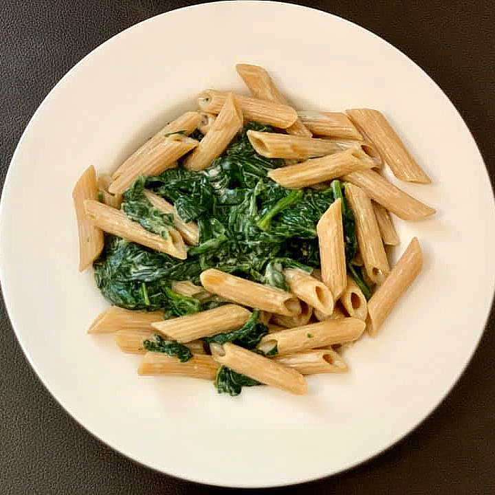 ✔ Макароны бобовые (из нута, чечевицы или гороха, сухие) — 100 г; ✔ Шпинат свежий — 100 г; ✔ Кокосовое молоко (консервированное, 17-20% жирности) — 100 г; ✔ Соль (для промывки шпината и варки макарон) — по вкусу. Чем может быть полезно это блюдо? Высоким содержанием растительного белка (на 100 г макарон приходится 18-20 г белка), пищевыми волокнами, содержащимися в макаронах и шпинате, витаминами группы В. И жирами (полиненасыщенными и мононенасыщенными), которые дадут энергию. Готовится очень просто! Все продукты по 100 грамм. Макароны отварить по инструкции, 8 минут. Шпинат промыть в подсоленной воде. Даже в упаковке, где написано «не мыть», можно найти слизняка). Влажный шпинат отправить на разогретую сковороду минуты на 2-3, потушиться в собственном соку. Влить кокосовое молоко (или можно обычные сливки), перемешать. Слить макароны, присоединить к шпинату. КБЖУ на 100 г – 138/6,2/4,9/15,4 (из них клетчатки ≈11,5 г крахмала и сложных углеводов, ≈2,7 г клетчатки). + 6 фото Рецепт на