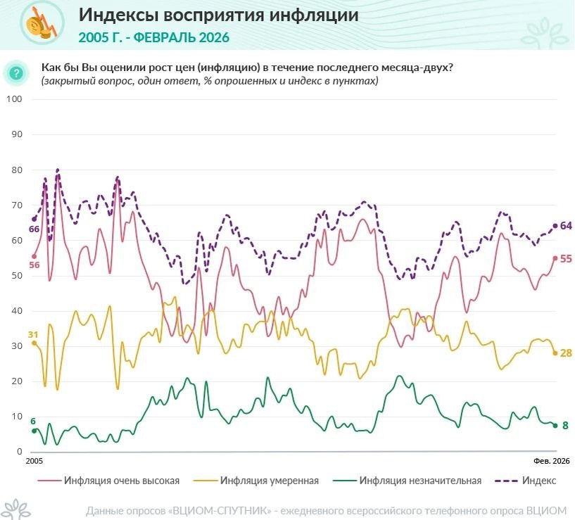 Индекс восприятия инфляции в феврале составил 64 пункта. Как следует из данных ВЦИОМ, показатель продолжает постепенно расти с сентября 2025 года. По сравнению с январем увеличилась доля россиян, считающих инфляцию очень высокой. Таких ответов стало больше на 3 процентных пункта. Исследование основано на всероссийском опросе. Респондентам предлагали оценить рост цен за последние один-два месяца. В зависимости от ответа применяются разные коэффициенты: для варианта «инфляция очень высокая» — 0,9, «умеренная» — 0,5, «незначительная» — 0,1. Индекс измеряют в диапазоне от 0 до 90 пунктов. Чем выше значение, тем чаще россияне говорят о заметном росте цен.