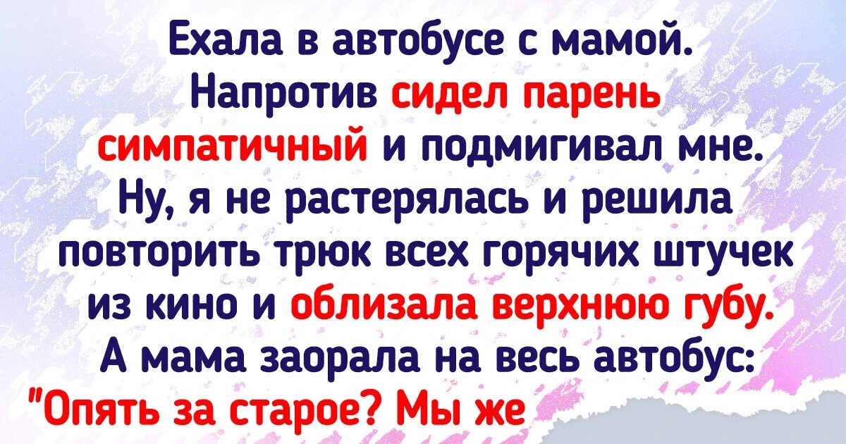Ехала в автобусе с мамой. Напротив сидел парень симпатичный и подмигивал мне. Ну, я не растерялась и решила повторить трюк всех горячих штучек из кино и облизала верхнюю губу. А мама заорала на весь автобус: «Опять за старое? Мы же это уже проходили! Сопельки нужно подтирать платочком, а не языком!»