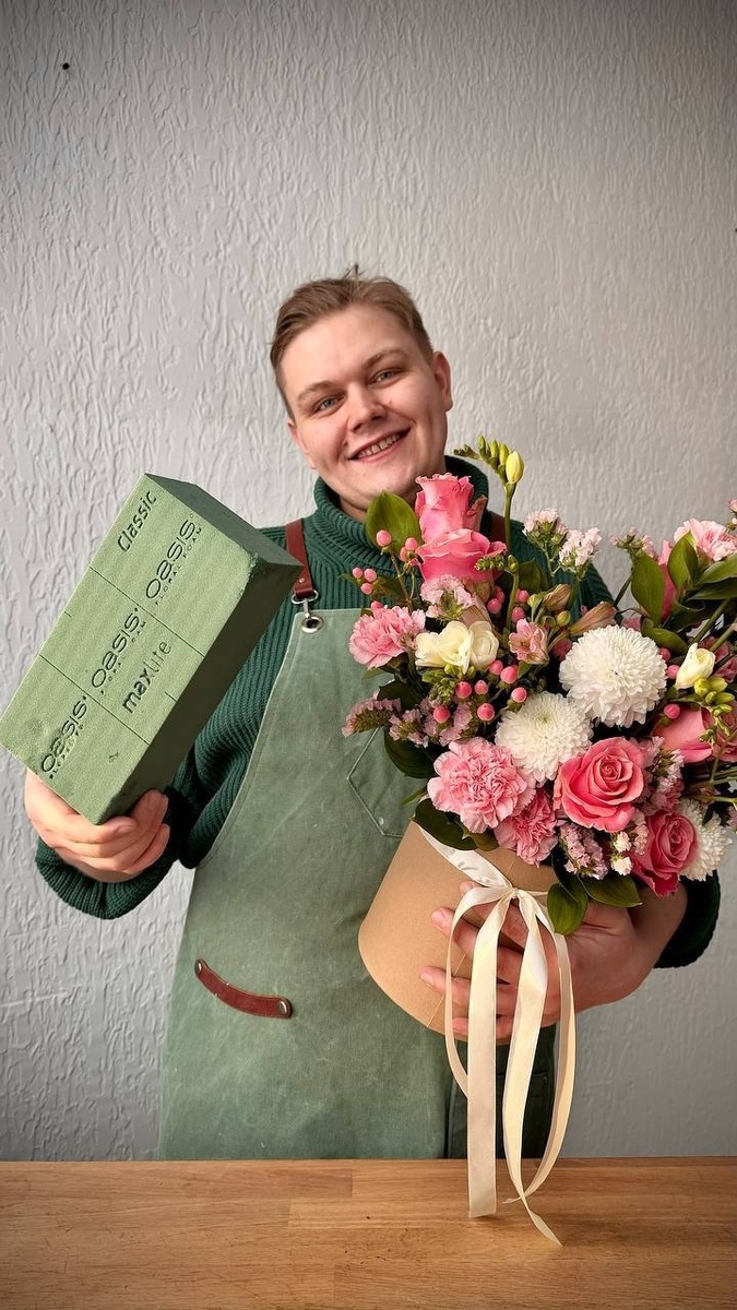 Ну что сказать, всякое бывает, земля им пухом. Чтоб ты понимала, я букеты по спирали научился собирать с 30 попытки. А до этого 30 раз крутил спираль на палках. Прям на настоящих палках. Ну не был я звездным учеником, что ж признаю. В общем, если ты не хочешь травматичный опыт и убивать цветы тебе не нравится, у меня есть гарантированный способ не разочароваться во флористике. С первой попытки получить вау-результат и вдохновиться на новые свершения. 🔥Это букет на оазисе! Именно поэтому для нашего практикума я выбрал мастер-класс «Композиция в кашпо с зонтиками». И у меня на это 5 причин (пропел я как Игорь Николаев). 1. В букете на оазисе невозможно загубить цветы. В основании композиции идет флористическая губка. В оазисе нет риска передавить цветы у основания. Цветок без воды не остается, из вазы вытащила, в мокрую губку воткнула. Если губку вымочить правильно, то дальше цветок уже точно не убьешь, даже если постараешься. 2. Материалы супер д