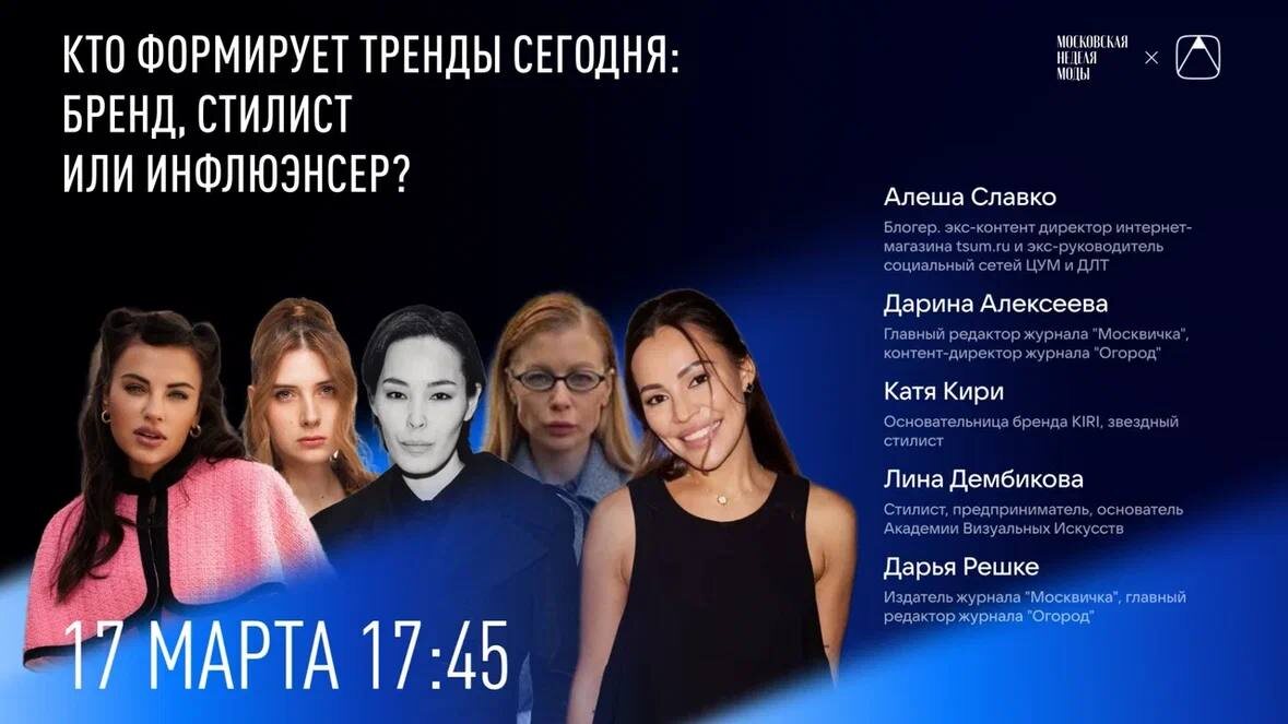 ?» Спикеры: блогер, экс-контент-директор интернет-магазина tsum ru и руководитель соц сетей ЦУМ и ДЛТ Алеша Славко, главный редактор журнала "Москвичка", контент-директор журнала "Огород" Дарина Алексеева, основательница бренда Kiri, звездный стилист Катя Кири, стилист, предприниматель, основатель Академии Визуальных Искусств Лина Дембикова, издатель журнала "Москвичка", главный редактор журнала "Огород" Дарья Решке. Попасть на программу лекций VK Лектория могут все желающие по предварительной регистрации на официальном сайте. Канал Московской недели моды теперь можно найти в MAX. Подписывайтесь!