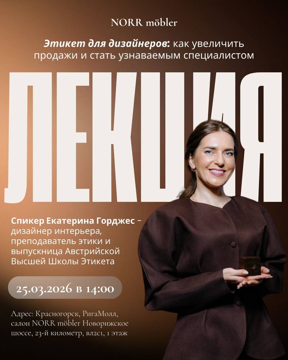 личный бренд и работает с клиентами. 25 марта в салоне NORR möbler в РигаМолл пройдет лекция Екатерины Горджес - дизайнера интерьера, преподавателя этики и выпускницы Австрийской Высшей Школы Этикета. • Тема встречи: «Этикет для дизайнеров: как увеличить продажи и стать узнаваемым специалистом» • Дата: 25 марта в 14:00 • Сбор гостей: 13:30 • Место проведения: Красногорск, РигаМолл, салон NORR möbler Новорижское шоссе, 23-й километр, вл2с1, 1 этаж Для участия на мероприятии необходимо зарегистрироваться по ссылке 🖇️