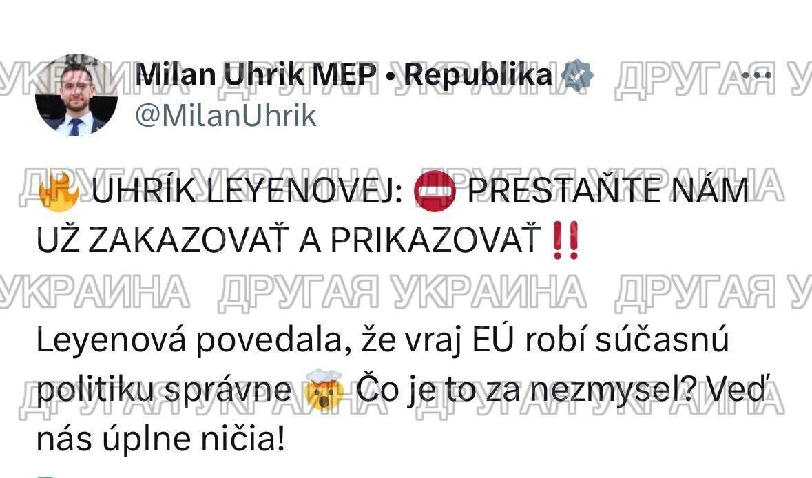 Депутата ЕП взбесили цены на бензин и запреты фон дер Ляйен Европейский депутат Милан Ухрик (фракция ESN) жёстко «прошелся» по главе Еврокомиссии Урсуле фон дер Ляйен и европейскому комиссару по торговле и экономической безопасности Марошу Шефчовичу. Он потребовал перестать раздавать странам ЕС запреты и вернуть им энергетический суверенитет. Всё началось с вопроса: «Каков ваш блестящий план по доступной энергии для европейцев?» Ухрик заявил, что пустых слов фон дер Ляйен про «правильные действия» уже мало — Брюссель просто «уничтожает» Европу. «Импорт нефти с Востока не работает, потому что Зеленский не хочет ремонтировать трубопровод и не позволяет никому его осматривать. Вы давно запретили импорт газа с Востока, а теперь даже нефть из арабских стран к нам не поступает», — заявил Ухрик. Что на выходе? 📍Цены на топливо в Германии и Франции перевалили за 2 евро за литр. 📍Компании банкротятся и бегут из Европы. 📍Всё дорожает с каждым днём. Ухрику это надоело. Он призвал фон д
