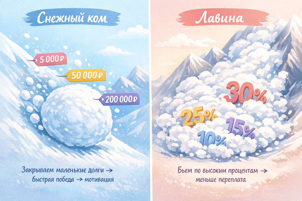 Я комбинировала: начала с маленькой кредитки (снежный ком), а потом переключилась на кредитку с дикими процентами (лавина). Мне так было комфортнее.
