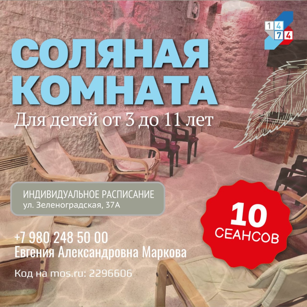 🧡 Соляная комната: новый набор! Приглашаем детей от 3 до 11 лет на оздоровительную программу «Соляная комната». 💪 Наши сеансы помогут укрепить иммунитет и улучшить общее самочувствие ребёнка. Особая атмосфера с насыщенным соляными частицами воздухом благотворно влияет на организм. 🔹 Стоимость курса из 10 сеансов — 5500 рублей 🔹 Адрес: ул. Зеленоградская, 37А 🔹 Запись на сайте mos.ru (код: 2296606) ⚠ Расписание составляется индивидуально Перед посещением необходимо получить направление от врача. По всем вопросам обращайтесь к Евгении Александровне Марковой: 📞 +7 980 248 50 00 Подробнее в МАХ. #ДОНМ #ДопОбразование