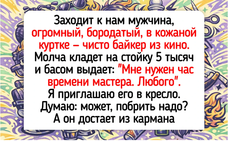 - Работаю парикмахером уже 10 лет, но такого клиента не забуду. Заходит к нам мужчина, огромный, бородатый, в кожаной куртке — чисто байкер из кино. Молча кладет на стойку 5 тысяч и басом выдает: «Мне нужен час времени мастера. Любого». Я приглашаю его в кресло. Думаю: может, побрить надо? А он достает из кармана детскую расческу с единорогом и говорит: «Учите меня плести „колосок“. Срочно». Целый час этот гигант пыхтел, путался в прядях на учебном манекене, психовал, но не сдавался. Я не выдержала, спросила, зачем ему это. Он покраснел и буркнул: «У дочки завтра утренник. Не хочу, чтобы моя принцесса там лохматая была». Уходил он уже с уверенным навыком плетения кос, а я потом полдня улыбалась. Настоящие мужчины — они такие.