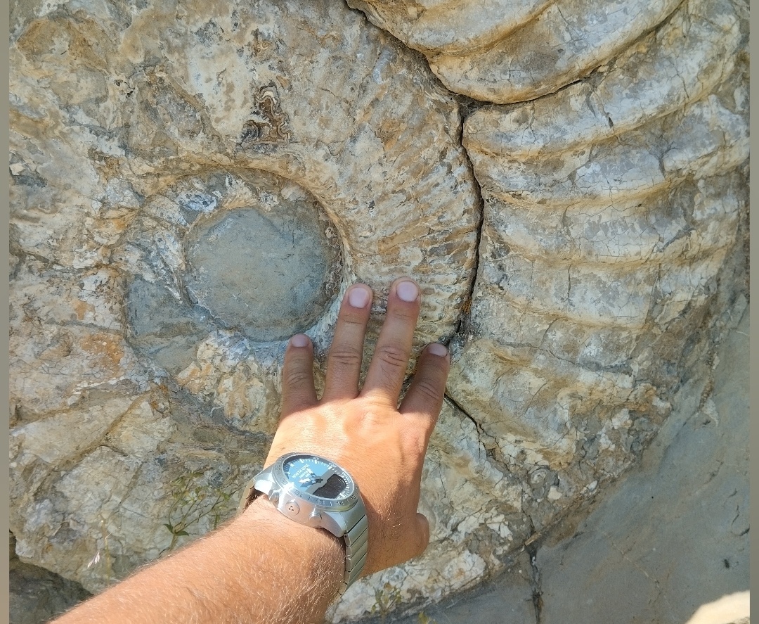 Так что же эти древние окаменелые раковины делают высоко в горах? Теперь начинается самое интересное. Давайте я расскажу эту историю, на примере вот этого самого моллюска, которого я трогаю на фотографии для того, чтобы показать вам наглядно его размер.