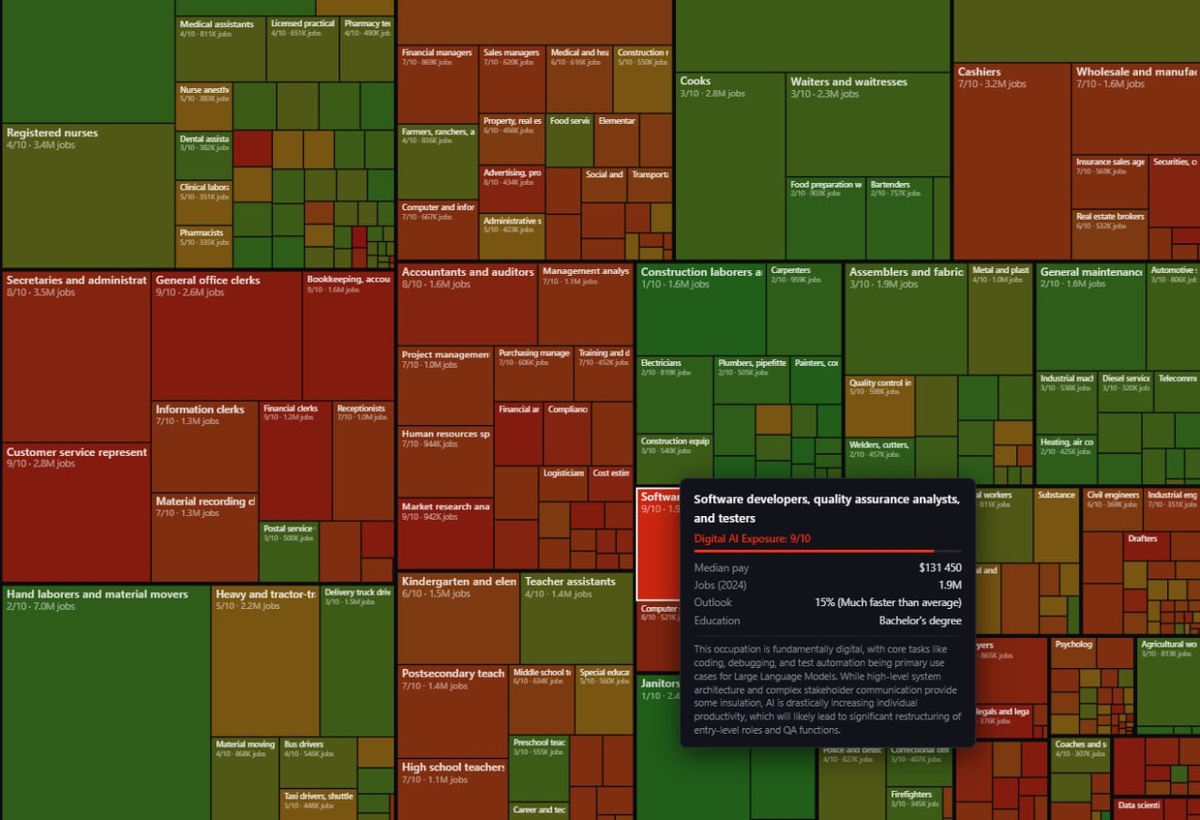 🤖 Андрей Карпаты выкатил очередной занятный пет-проект — US Job Market Visualizer. Это интерактивная карта рынка труда США (143 млн рабочих мест, 342 профессии), где каждая специальность оценивается по уровню «AI Exposure» (уязвимости перед ИИ). Что там по программистам? У Software Developers оценка 9/10. Мы в глубокой красной зоне. Значит ли это, что пора учиться класть плитку? Ни разу. Карпаты указывает, что высокая уязвимость не равна исчезновению профессии. Написание кода, дебаг и автоматизация тестов — идеальный юзкейс для LLM. Продуктивность одного инженера улетает в космос. Спрос на разработчиков может даже вырасти, но платить будут за проектирование архитектуры, коммуникацию со стейкхолдерами и решение бизнес-задач. А вот линейным кодерам, слепым исполнителям тикетов и ручным тестировщикам соболезную — этот сегмент реструктуризируется первым. Что ещё интересного: ▫️ Всего 4.4% рабочих мест имеют минимальный риск (кровельщики, грузчики, дворники). Физический труд пока вне