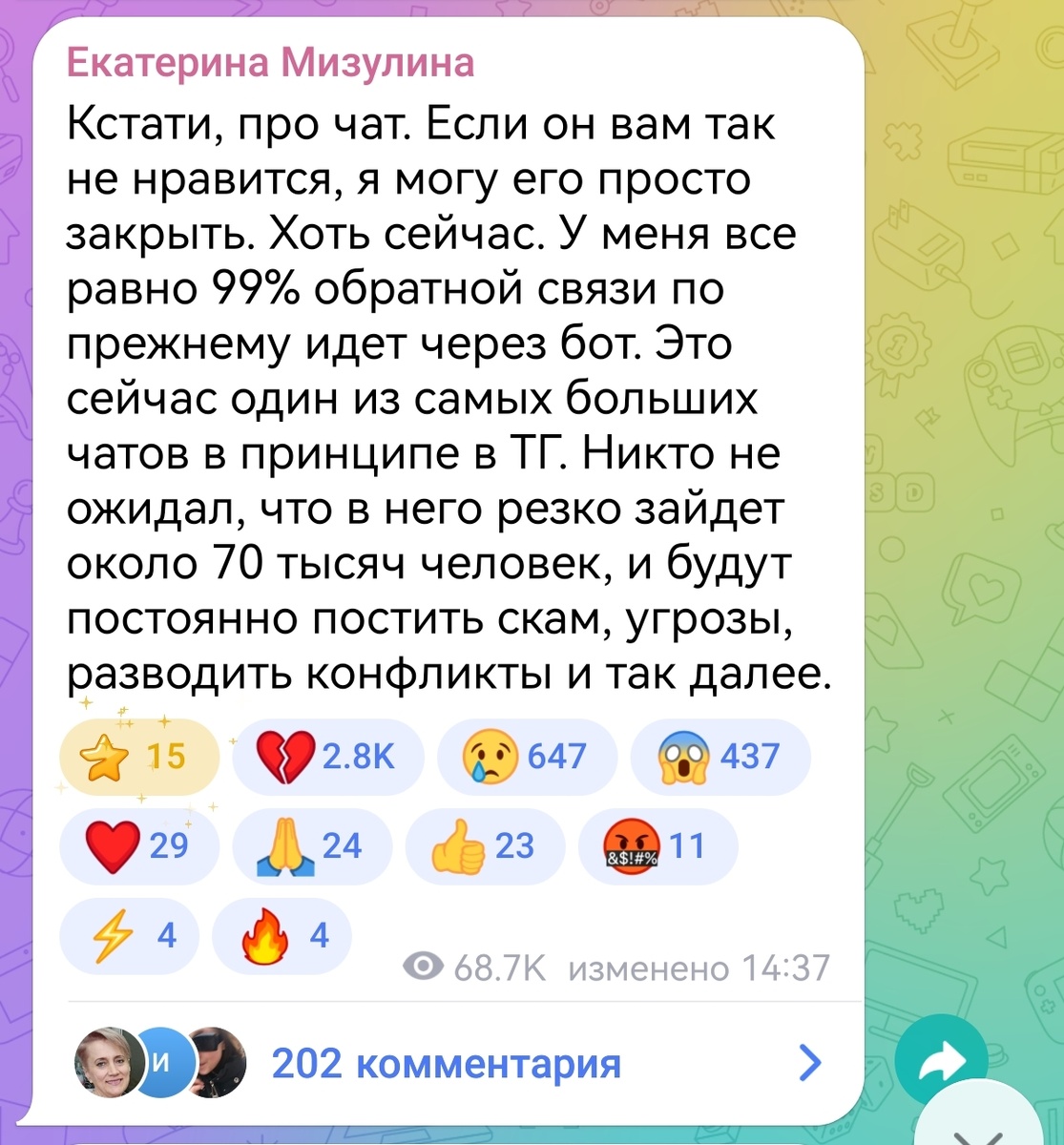 Екатерина написала, что может закрыть свой чат. Но проблема в том, что чат, судя по всему, уже превратился в проходной двор, куда залетели 70 тысяч человек, чтобы... поугрожать. Вы серьезно думаете, что эти люди будут лайкать клипы? Они пришли за хлебом и зрелищами, а точнее — за скандалом.