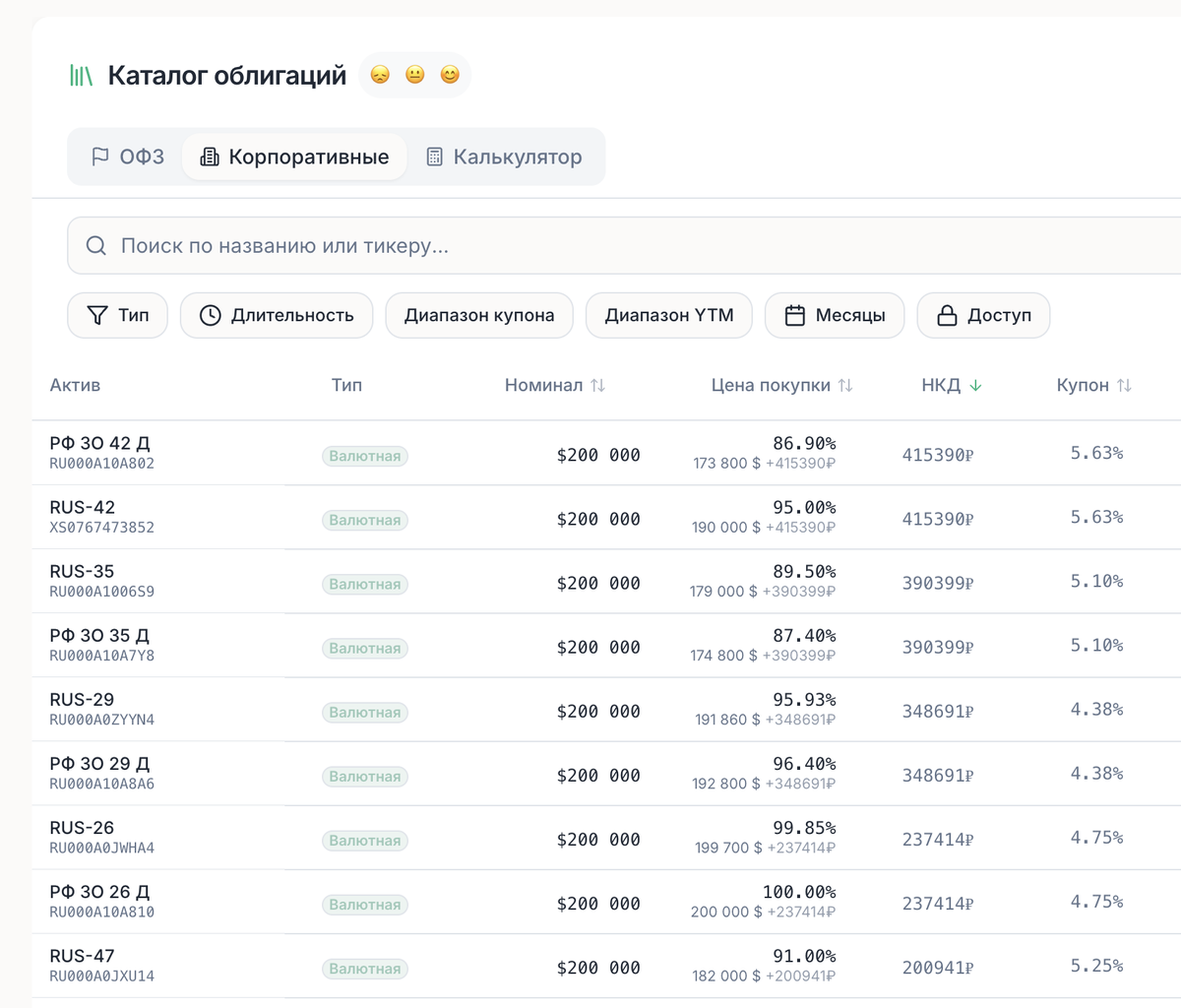 - Фильтрация по НКД: Можно отсеять весь рынок и оставить только те облигации, где НКД близок к нулю.