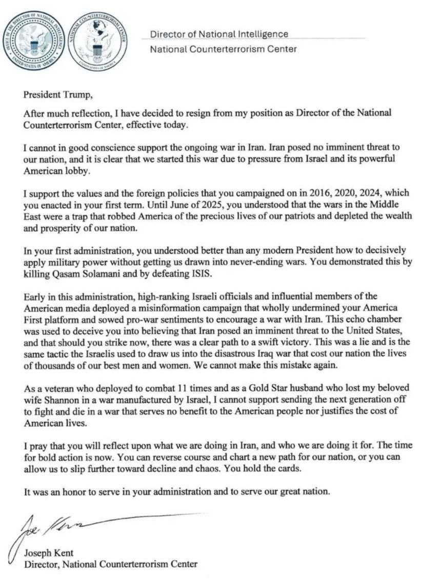 контртеррористического центра при Белом доме Джо Кент. Кент утверждает, что его ведомство не подавало Трампу докладов, где говорилось бы о том, что "Иран угрожает ударами и терактами в отношении американских граждан". Чиновник глубоко сомневается, что военная операция США против Ирана вообще опиралась хоть на какие-то объективные данные, кроме как на информацию из Израиля. Я не могу с чистой совестью поддерживать продолжающуюся войну в Иране. Иран не представлял непосредственной угрозы для нашей страны, и очевидно, что мы начали эту войну из-за давления со стороны Израиля и его мощного американского лобби, – говорится в заявлении. Подпишись ТГ / Подпишись МАХ