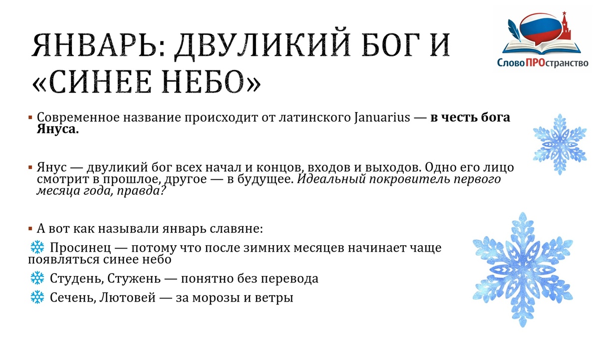 Мы каждый день пишем эти слова в датах, но задумывались ли вы, почему январь — это "январь", а март — это именно "март"? И при чем тут древнеримские боги, кузнечики и Юлий Цезарь? «СловоПРОстранство» отправляется в этимологическое путешествие по календарю. Смотри карточки — узнаешь много нового и интересного! Исторический факт: современные названия месяцев пришли к нам из Древнего Рима через Византию вместе с христианством . До крещения Руси у наших предков был свой календарь — с названиями, которые отражали природу и жизнь земледельцев . Но в XVII-XVIII веках латинские названия окончательно вытеснили исконно русские. Хотя, например, в белорусском языке древние названия месяцев сохранились до сих пор! Пишите в комментариях свой любимый месяц и его славянское название, нам будет интересно узнать о ваших предпочтениях И подписывайтесь на «СловоПРОстранство», чтобы каждый день узнавать что-то новое о русском языке!