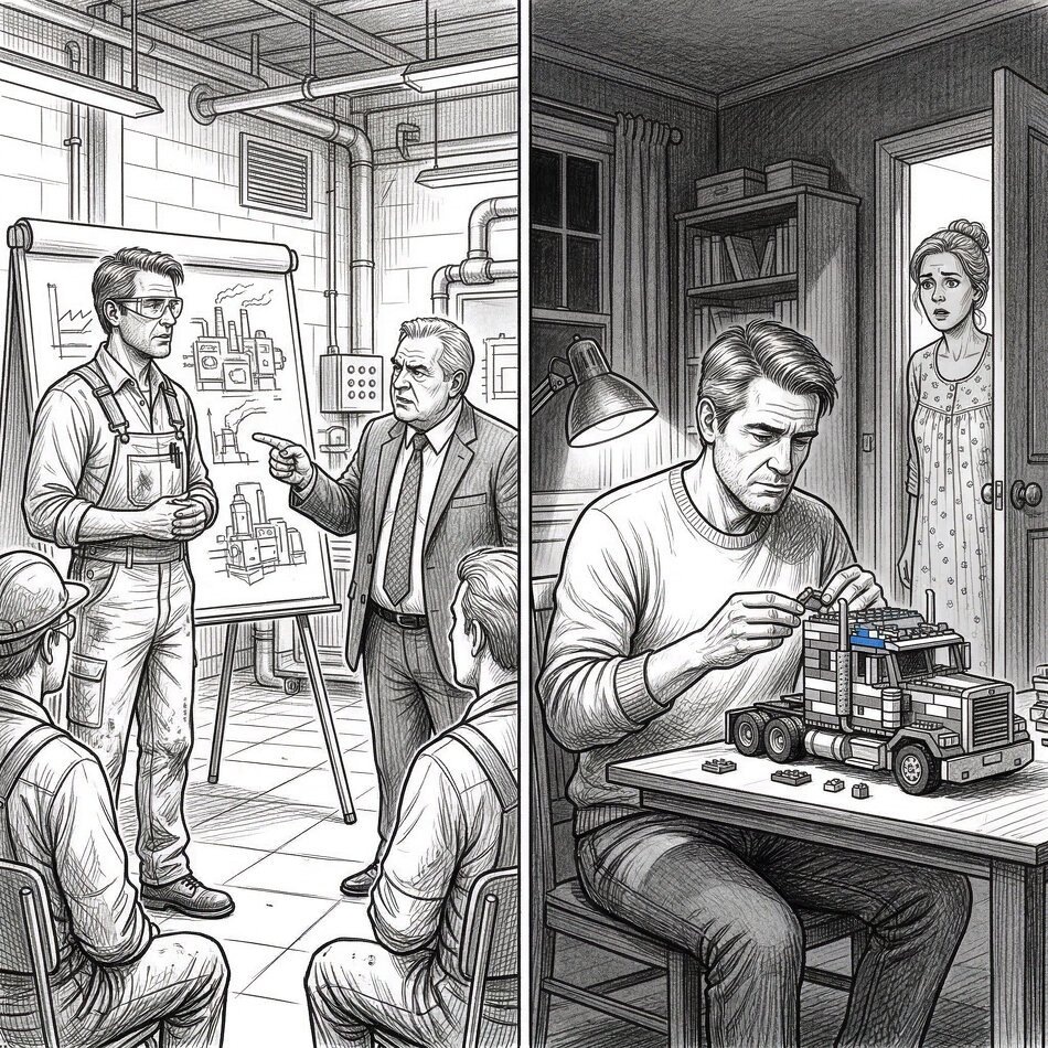 Вот Дмитрий, 44 года, главный инженер на производстве. На планёрке генеральный публично раскритиковал его проект модернизации цеха. Двадцать человек в зале. Дмитрий кивнул: «Учту замечания, подготовлю доработку к среде». Голос ровный, поза спокойная. В курилке коллега спросил: «Ну как ты?» – «Нормально, рабочий процесс». Вечером дома жена заметила, что он третий час молча собирает конструктор, купленный для сына. Руки чуть заметно дрожат. Сын давно спит.