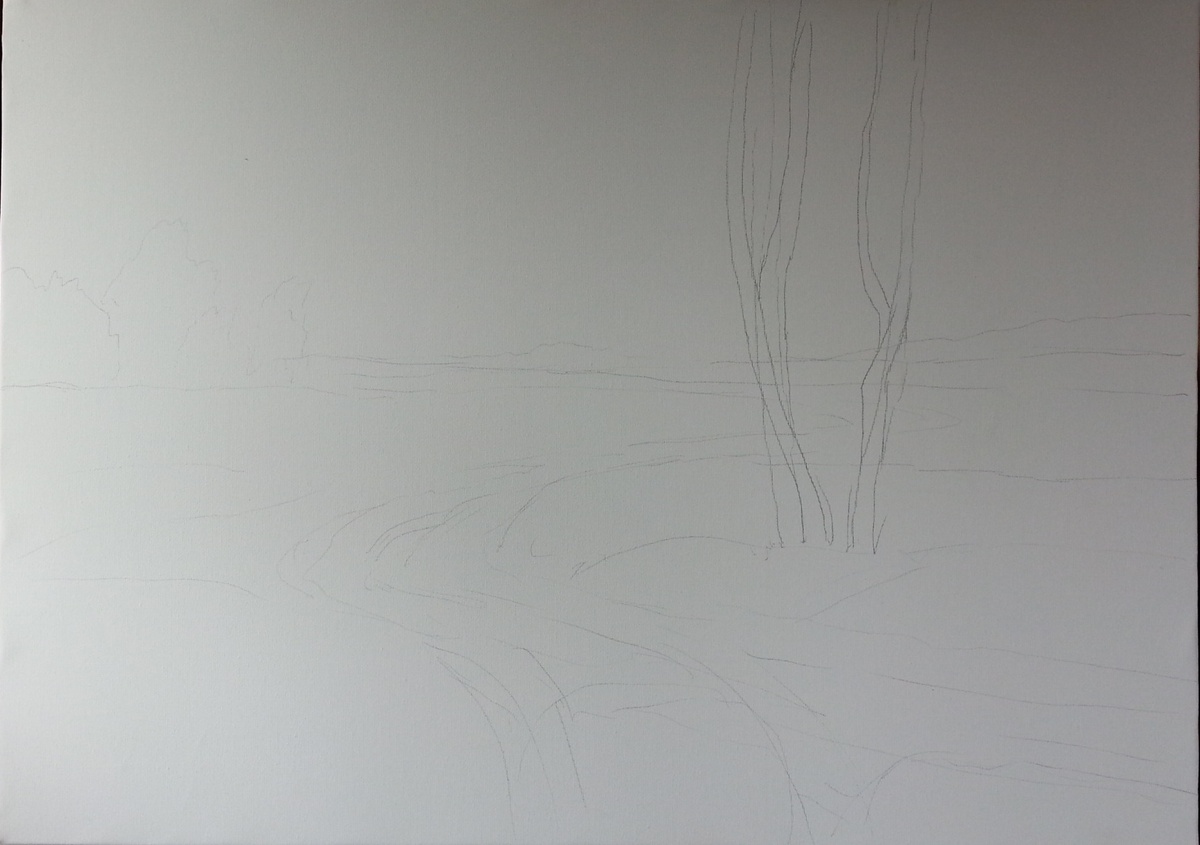 На этом этапе важно не точное попадание, а направление. Где будет проходить линия движения, как распределится пространство, куда пойдёт взгляд. В пейзаже это особенно заметно.