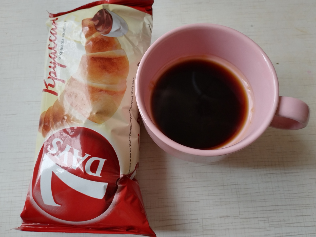 Да, неполная чашка кофе! Я не отпила. Завариваю дрип-пакеты, получается 180-190 миллилитров кофе. Круассан, потому что нет сил сделать бутерброд. Ещё круассан намного дешевле бутерброда.
