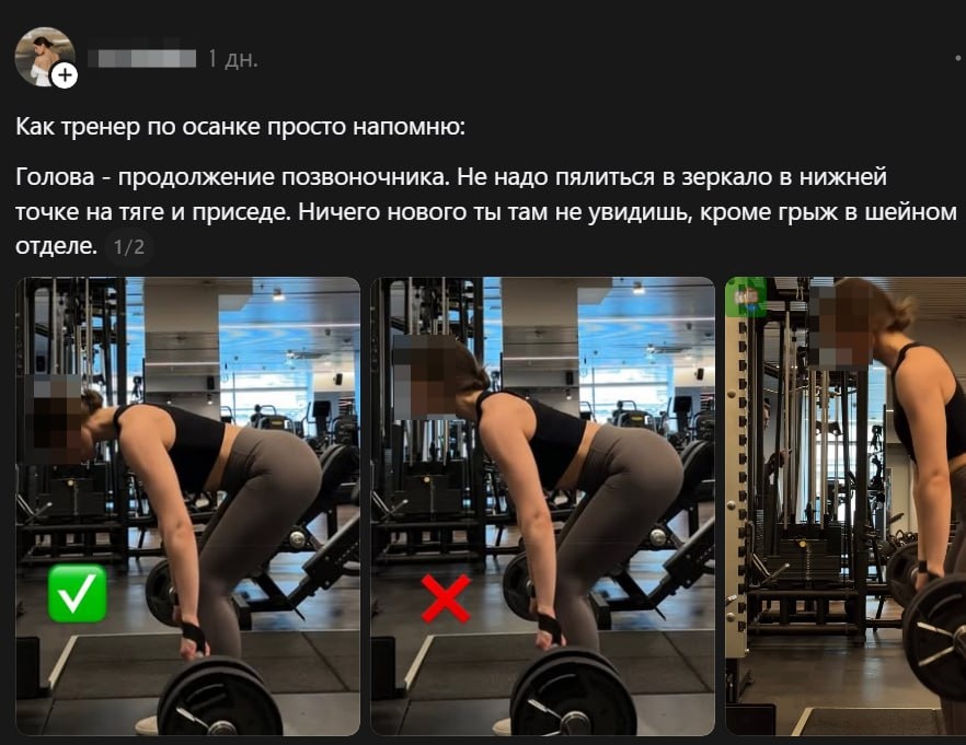 ?🤔 Многим из нас хочется получить чёткую инструкцию формата "делай так и всё будет". Отсюда и поиски той самой техники, которая решит все наши проблемы, даст +100 к силе и выносливости и докинет тело мечты вдобавок Но давайте говорить честно, как специалисты. Опытный тренер понимает, что правильность техники это индивидуальный параметр и всегда зависит от массива контекста Разберём на очередном примере из запрещённых соц. сетей (на фото). Тренер по осанке пугает подписчиков грыжами в шейном отделе, если они будут допускать переразгибание в шейном отделе во время выполнения румынской тяги. Разберём по пунктам: 1️⃣ "Голова — продолжение позвоночника" — поспорить сложно, факт. Но это НЕ означает, что изменение изгиба в шее недопустимо 2️⃣ "Не пялься в зеркало" — почему? Если человек так лучше концентрируется, более устойчив, то это может быть наоборот хорошим решением 3️⃣ "Грыжи будут" — это просто классическая страшилка, которой обучают на сомнительных курсах, чтобы продажи поднима