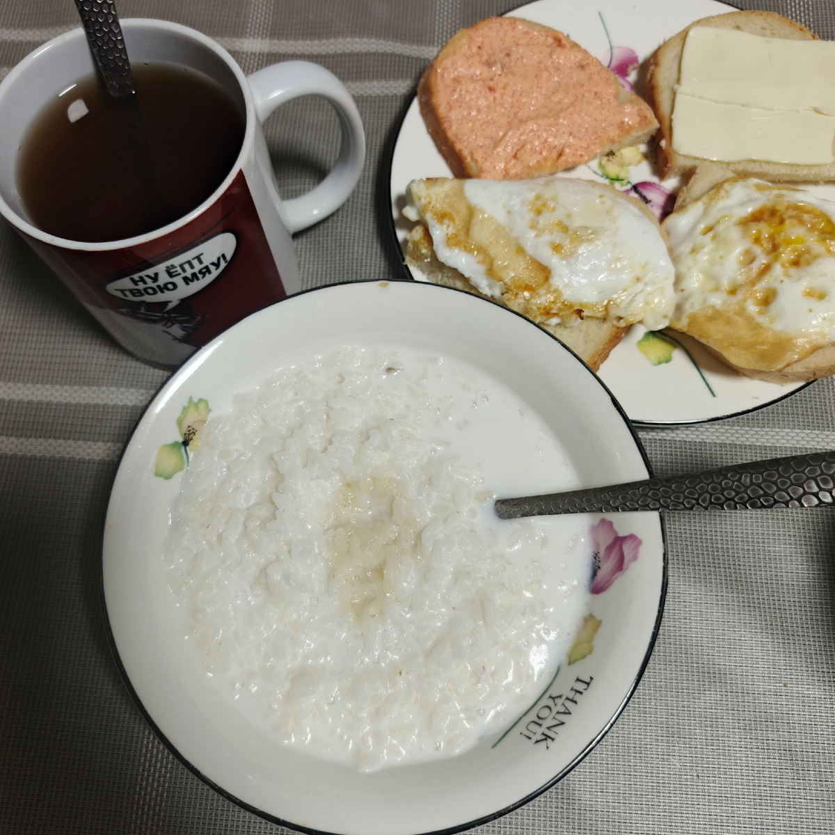Здравствуйте! Итак, Катя в отпуске, Катя как следует решила оторваться. Начала с сытного завтрака, и понеслось. Сперва почистила духовку. Кто-то не любит гладить, кто-то - мыть полы. Я не люблю мыть духовку и микроволновку. Микроволновая печь у меня стоит высоко, мне это просто неудобно. А духовку я не люблю мыть в принципе. Сделала и то, и другое. Взялась за готовку. Наготовила всего, и, как знала, что на понедельнике мой отпуск и завершится. Да, вчера и сегодня я уже работаю, причем в обе смены. Так бывает, виноватых нет, в жизни случается всякое. Уходила вчера с чистой совестью, что дома есть, что поесть. Но этого явно будет недостаточно, так как я, как минимум, три дня буду отсутствовать дома больше 12 часов. но мы обязательно что-нибудь придумаем. А теперь покажу, чем же я кормила семью в первый день отпуска своего. На завтрак рисовая молочная каша с медом и с бутербродами. Бутерброды с жареным яйцом, икрой, маслом. К этому всему чай и кофе. Кстати, икра КД очень насыщенная н