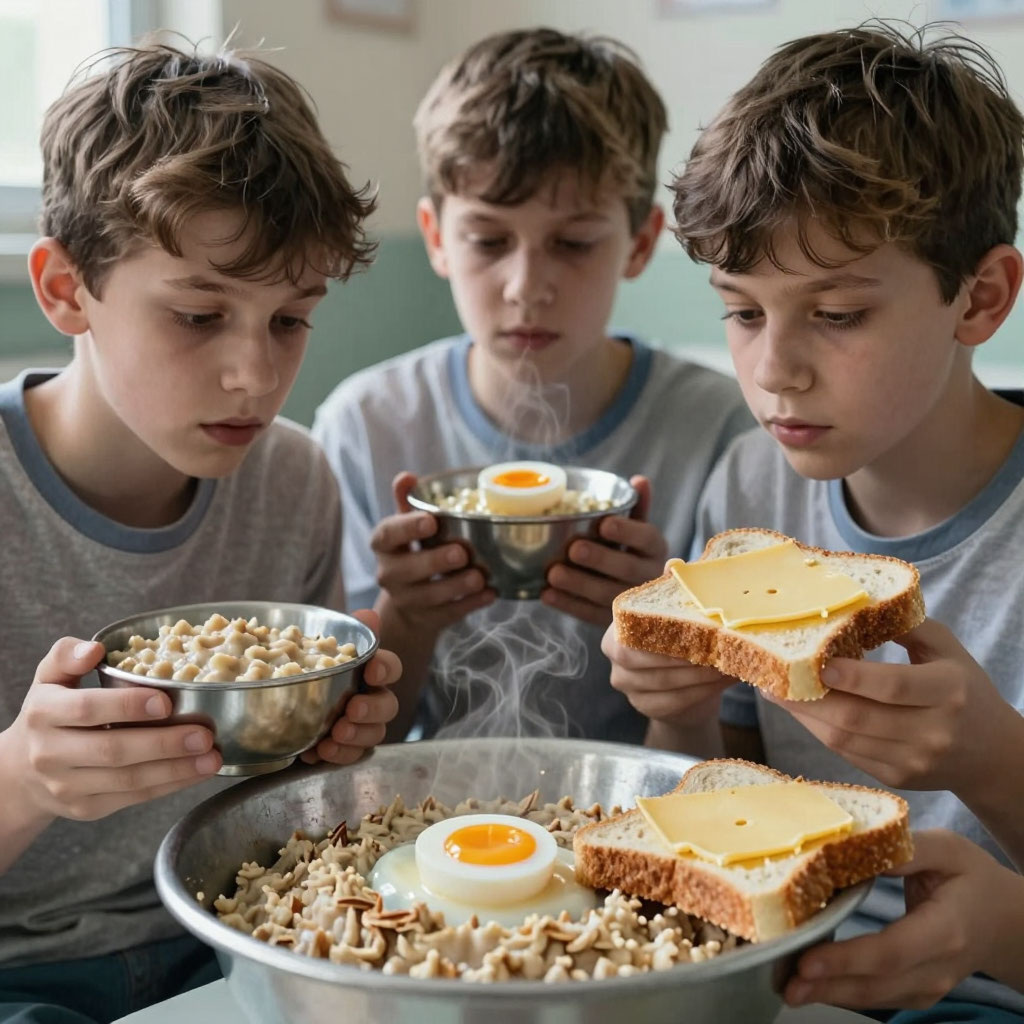 На подносах лежали одинаковые порции: вязкая овсяная каша в алюминиевых мисках, половинка варёного яйца, ломтик серого хлеба и стакан тёплого чая без сахара. Запах еды был почти неуловимым — будто её специально готовили так, чтобы не вызывать аппетита. Марк без интереса ковырял кашу ложкой, Артём сосредоточенно очищал яйцо, а Илья украдкой оглядывался на санитара. Тот стоял у двери, листал блокнот и время от времени поднимал глаза на пациентов.