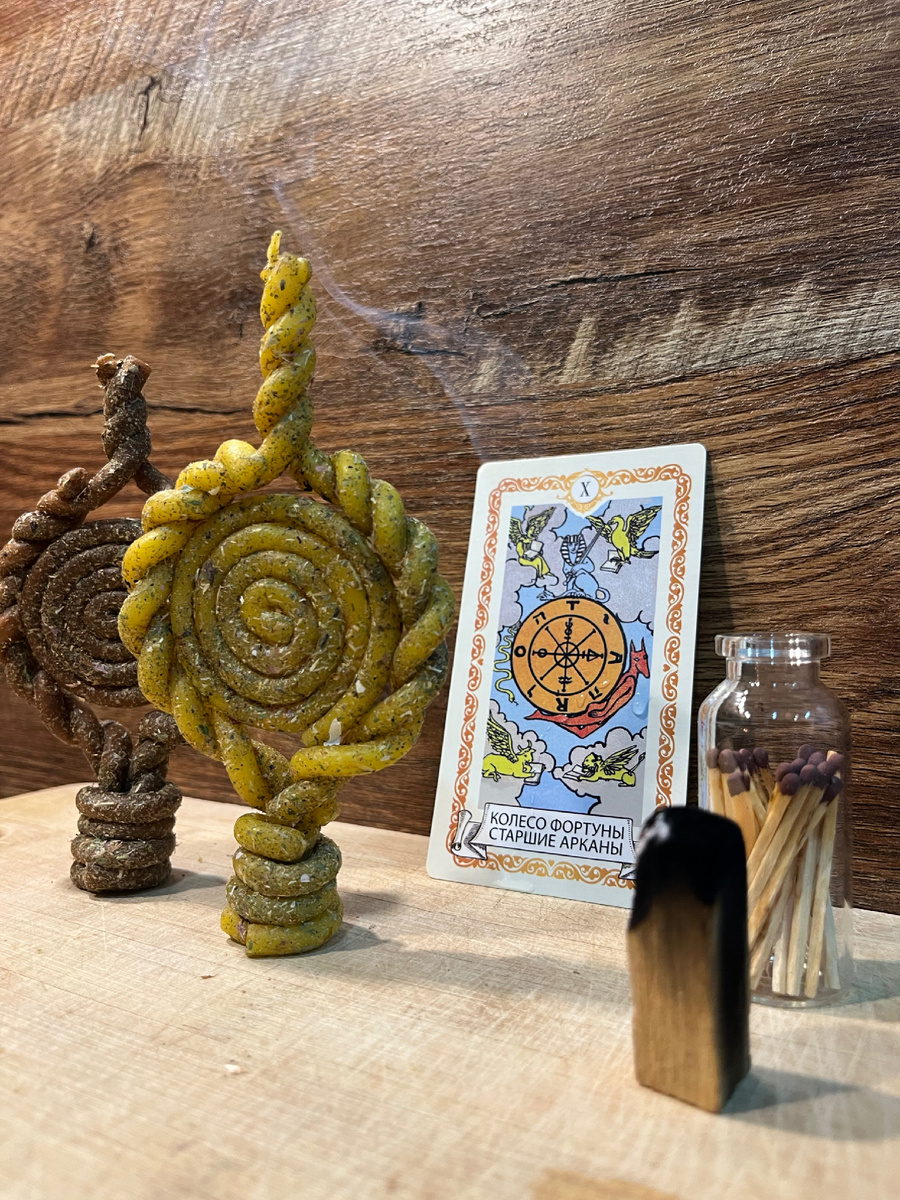 Программная свеча «Колесо фортуны» создана на основе символики 10‑го старшего аркана Таро — знака благоприятных перемен, удачи и движения вперед.