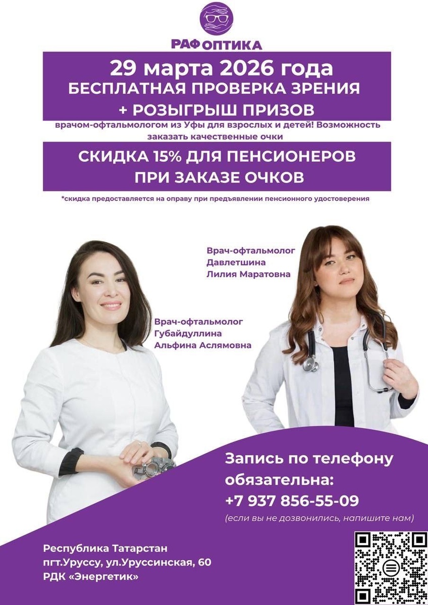 Уруссу! 👓 + РОЗЫГРЫШ ПРИЗОВ! 📍пгт. Уруссу, ул. Уруссинская, д. 60 - РДК «Энергетик» ⏰ 29 марта, с 10:00 до 18:00. Проверим зрение всей семье и подарим подарки! 🎁 РОЗЫГРЫШ №1: Беспроигрышный! Каждый, кто пройдёт диагностику, получит приятный подарок. 🏆 РОЗЫГРЫШ №2: Главный! Все заказы очков, сделанные с 31 января по 30 апреля, участвуют в розыгрыше ценных призов! ✅ Проверка остроты зрения, глазного дна, давления. ✅ Консультация офтальмологов из Уфы. ✅ Подбор и заказ очков на месте. ✅ Пенсионерам — скидка 15% на оправы. ❗ Запись обязательна! 📞 +7 (937) 856-55-09 (если не дозвонились — пишите: taplink.cc/rafoptikaufa) Подписывайтесь, чтобы не пропускать новости: vk.com/raf.optika