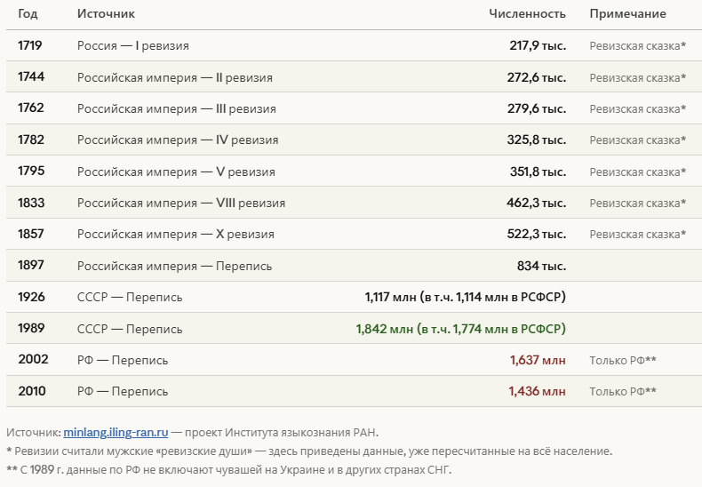 Нам известны данные по численности чуваш по материалам переписей и ревизских сказок. Естественно, что чем дальше в прошлое, тем выше погрешность, но, тем не менее, что есть — то есть. А что, если попытаться с помощью экстраполяции заглянуть в прошлое и посмотреть, сколько же чувашей жило в XV веке? А в XIII? А в X? Давайте попробуем это сделать. Итак, нам известны следующие данные по численности чуваш: Обратите внимание на любопытную деталь в данных: между III и IV ревизиями (1762→1782) прирост +46 тыс., а между II и III (1744→1762) — всего +7 тыс. Это объясняться тем, как проводился учёт, а не реальной демографией, но как писал выше ничего не поделаешь - что есть то есть... А вот график: Не будем сейчас о печальной тенденции последних переписей. Нас интересует другое. Метод: экстраполяция назад от 1719 (217,9 тыс.) с тремя сценариями годового прироста — 0,3%, 0,5% и 0,7% — чтобы показать диапазон неопределённости. Почему именно эти ставки? Средний прирост между ревизиями 1719–1795 со