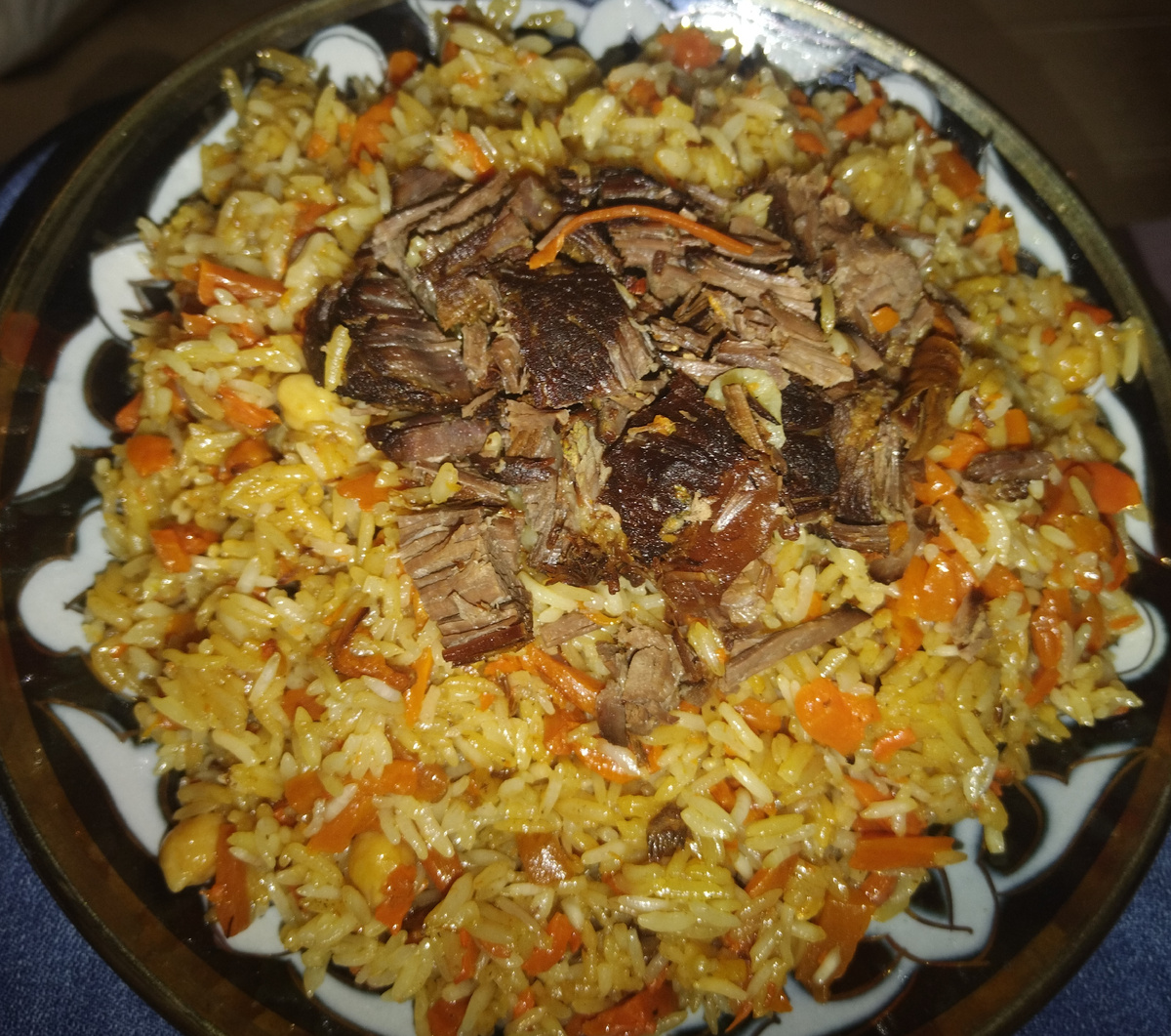 Вкуснейший. С бараниной. Горячий, ароматный . Рассыпчатый, рисинка к рисинке. Золотистый. Глаз радуется.