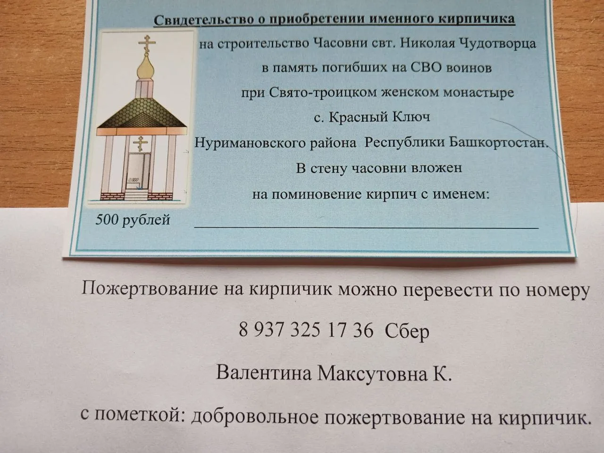 При Свято-Троицком женском монастыре села Красный Ключ Нуримановского района буде строится часовня во имя святителя Николая Чудотворца в память о воинах, погибших на СВО, где будут молиться и поминать наших защитников. Каждый желающий может поучаствовать в этом добром деле. Есть возможность приобрести именной кирпичик, который будет заложен в стену часовни в память о близком человеке или просто как вклад в строительство. Пожертвование на один кирпичик — 500 рублей. Если у вас есть желание помочь и внести свою лепту в строительство часовни, пожертвование можно перевести по номеру телефона: 📞 8 937 325 17 36 (Сбербанк) Получатель: Валентина Максутовна К. Пожалуйста, укажите в комментарии к переводу: «Добровольное пожертвование на кирпичик». Подробности можно узнать по номеру телефона: 8 937 340 64 39. Даже небольшой вклад — это помощь в создании святого места памяти и молитвы. Будем очень благодарны за поддержку и репост, чтобы как можно больше людей узнали об этом деле. Храни вас Бог.