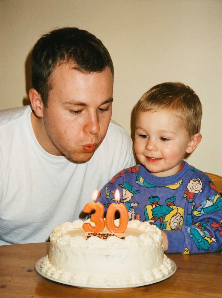 В этот раз я нашел милую идею с тортом на День рождения. Рассказываю как повторить вам: Как повторить: 1. Переходим в SyntX – https://syntx.ai/welcome/0yJ1A5Es 2. Выбираем «Дизайн» – «Nano Banana Pro» и ставим следующие настройки: 3. Загружаем ваше фото 4. Пишем нужный промт: A warm vintage-style indoor birthday photo shot on Kodak Gold 200 film camera. Heavy film grain, visible film noise, grainy texture throughout the entire image, coarse grain structure like expired 35mm film stock. A young man around 28 years old on the left side is leaning forward to blow out candles on a birthday cake. He has short dark brown hair with a fade haircut, clean-shaven face with NO beard, NO mustache, NO facial hair at all, smooth skin on his face, wearing a plain white t-shirt. Next to him on the right is a small toddler boy around 3 years old with a simple short straight haircut, NOT curly hair, NOT wavy hair, regular straight short brown hair, smiling sweetly, wearing a colorful purple-blue cartoon