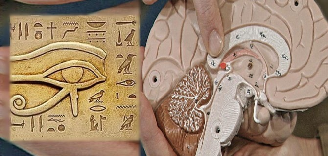 Если сделать сагиттальный срез человеческого мозга, можно увидеть, что египетский Глаз Гора — это точная анатомическая карта таламуса и шишковидной железы. Как цивилизация 5000-летней давности могла знать точное расположение железы, которую современная наука начала постигать только в XX веке?
