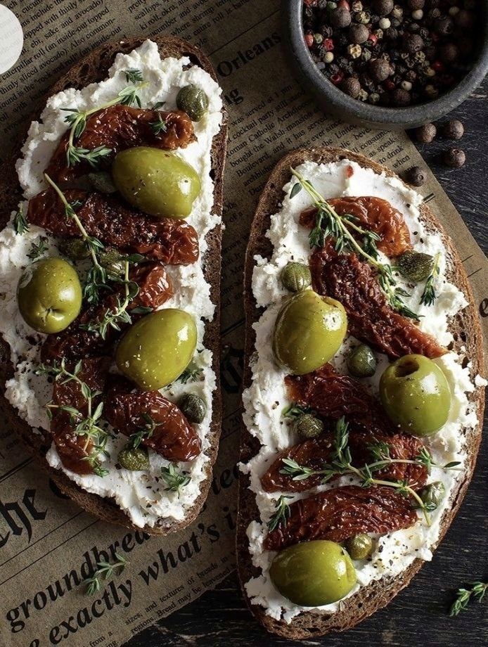 🍽 А вот это вполне себе идея для перекуса: цельнозерновой хлеб, творожный сыр без добавок и ароматизаторов, оливки, каперсы, вяленые томаты и свежий розмарин😍 Вот такие закуски я люблю. Легко, сытно и без сахара. Вяленые томаты от шефа ТУТ. РЕЗЕРВНЫЙ КАНАЛ В VK #питание #рецепты