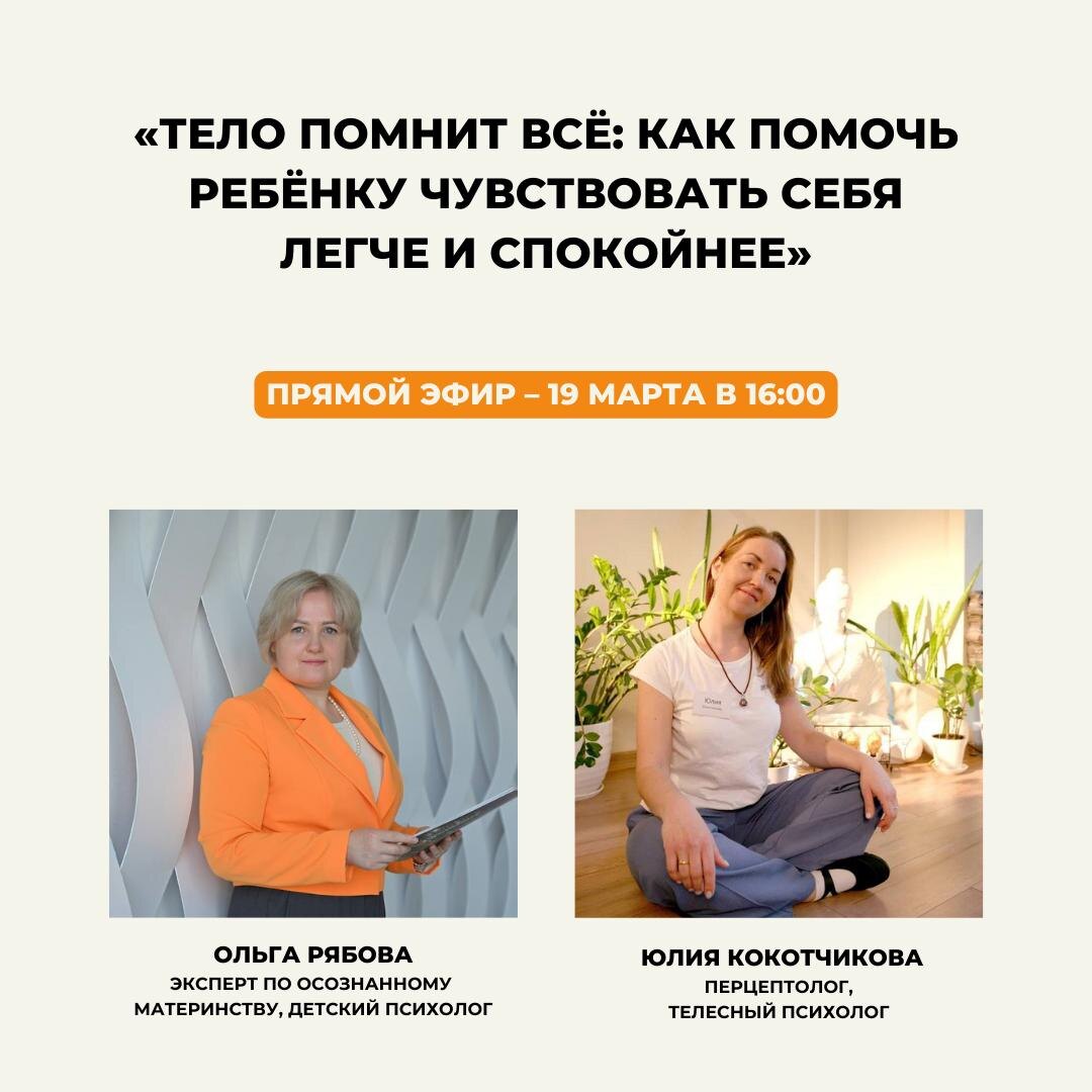 19 марта в 16:00 проведём прямой эфир на тему: «Тело помнит всё: как помочь ребёнку чувствовать себя легче и спокойнее» Эфир проведу я, Ольга Рябова, совместно с Юлией Кокотчиковой — телесным психологом. Юлия работает с телесными реакциями ребенка, с различными диагнозами, помогает в решении хронических заболеваний. Помогает родителям лучше понимать телесные сигналы детского организма. Иногда ребёнок ещё не может словами объяснить, что его беспокоит. Но тело может показывать это через сон, напряжение, поведение или чувствительность. Разберем 3 важные темы: ❤️«Кесарево сечение»; ❤️«Последствия прививок»; ❤️ «Аллергии и кожные реакции». На эфире поговорим о том: — как телесный опыт рождения может влиять на ребёнка — почему иногда сохраняется напряжение после медицинских процедур — как через тело могут проявляться аллергические реакции — какие сигналы ребёнка родителям важно замечать, На эфире поговорим еще о роли маминого психоэмоционального состояния. Во время эфира можно будет