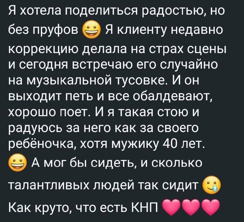 пытаются обойти стороной. Кажется, что проблема в сцене, в голосе или в подаче, и человек годами ходит на ораторское, тренирует речь, учится «говорить правильно», а у него всё равно включается тело, которое зажимается, буксует, теряет мысль или делает вид, что ему просто нечего сказать. Потому что страх сцены и трудность говорить это чаще всего не про речь как навык. Это про программу мозга🧠, где проявляться опасно, а внимание других людей считывается как риск. Именно поэтому у одних застревают слова, у других пропадает голос, а кто-то вроде бы говорит, но его не слышат и не воспринимают всерьёз😞. Мозг просто гасит импульс говорить свободно, даже если у человека есть идеи, знания и внутренний запрос быть услышанным. 💫И когда эта программа убирается в коррекциях, у человека появляется то, что невозможно натренировать усилием воли: - свободная речь, - ощущение опоры в голосе, - спокойствие в моменте, - естественное внимание со стороны людей. На скринах это видно очень живо: кто-т