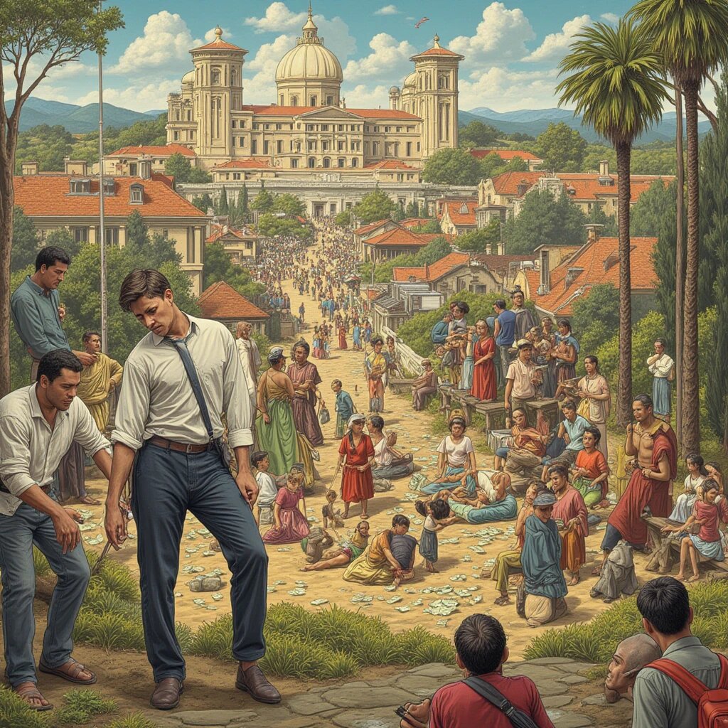 - Экономический парадокс: Наличие ресурсов («денег») не приводит к улучшению жизни. Главный компонент системы — статичное большинство, из которого меньшинство выкачивает ресурсы.