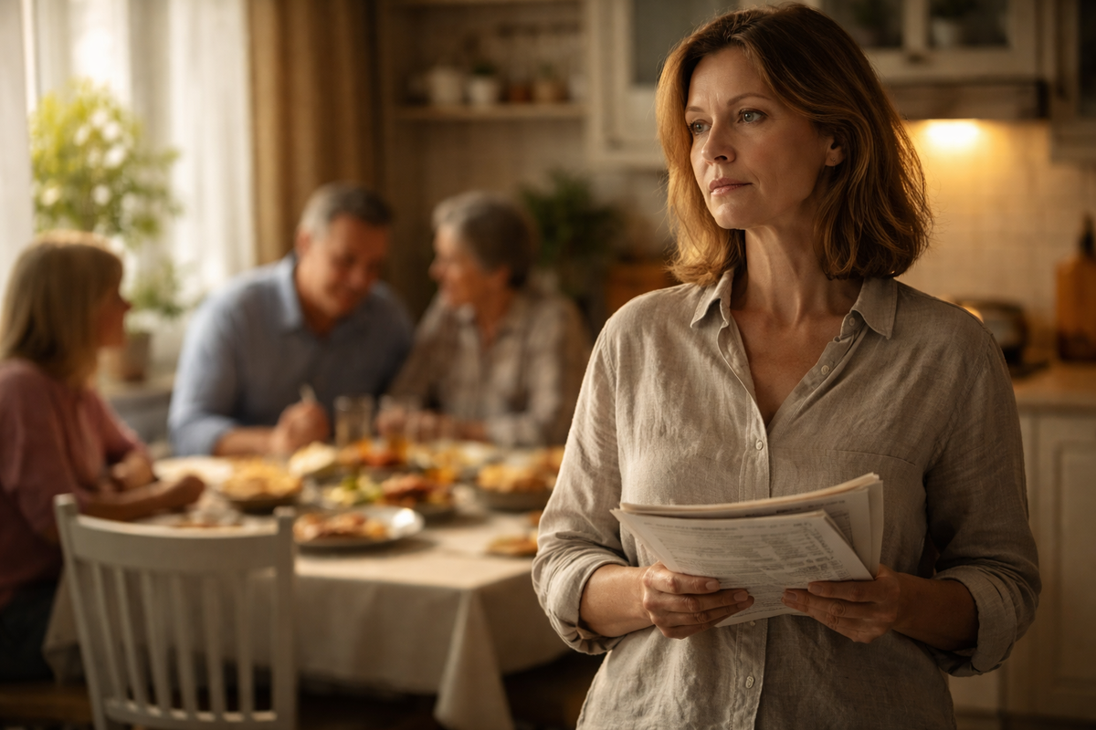 Лидия поставила на стол четвёртую миску с салатом, поправила сбившуюся салфетку и привычно отошла к плите, хотя все уже расселись. Она всегда двигалась так, будто её место было не рядом с остальными, а между кастрюлей, чайником и буфетом, где в старой папке лежали чеки, списки покупок и сложенные вдвое квитанции за много лет.