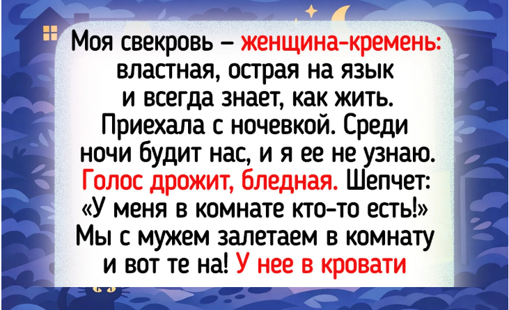 - Моя свекровь — женщина-кремень: властная, острая на язык и всегда знает, как жить. Приехала с ночевкой. Среди ночи будит нас, и я ее не узнаю. Голос дрожит, бледная. Шепчет: «У меня в комнате кто-то есть!» Мы с мужем залетаем в комнату и вот те на! У нее в кровати наш кот Барсик. Оказалось, наш интроверт проспал весь ее визит в шкафу и вышел на разведку только ночью. Свекровь, мгновенно вернув себе величие, выдала: «Я думала, вы его отдали — я же сказала, что он мне не нравится!».