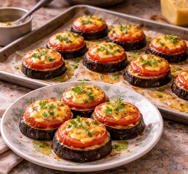 Бывают вечера, когда стоишь перед холодильником и думаешь: силы на исходе, а кормить надо. Именно для таких случаев я держу в запасе этот рецепт. Двадцать пять минут в духовке — и на столе горячее, красивое, с тянущимся сыром. Два баклажана и четыре помидора мою, режу кружками — толщиной примерно полсантиметра. Баклажанные кружочки солю с обеих сторон и откладываю на десять минут, пусть выпустят горечь. Володя всегда удивлялся этому шагу: «Зачем они у тебя тут лежат и потеют?» А затем, говорю, что без этого будет горько. Пока баклажаны отдыхают, давлю четыре зубка чеснока через пресс и заливаю парой ложек кипятка — получается чесночная водичка, ароматная, злая. Двести граммов твёрдого сыра тру на тёрке. Противень застилаю пергаментом, смазываю маслом. Промокнув баклажаны от лишней влаги, раскладываю кружочки и кисточкой промазываю каждый чесночной водой. Сверху — щедрую щепотку тёртого сыра, чуть перца. На сыр укладываю помидорный кружок, слегка подсаливаю. Духовка к этому моменту уже